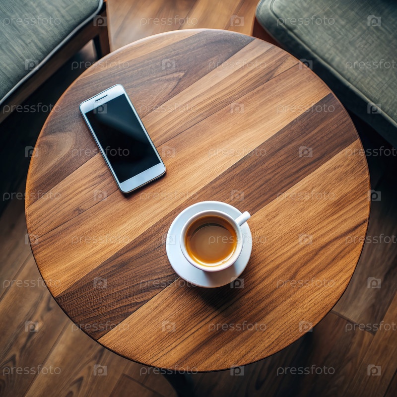 Чашка кофе и телефон на деревянном столе