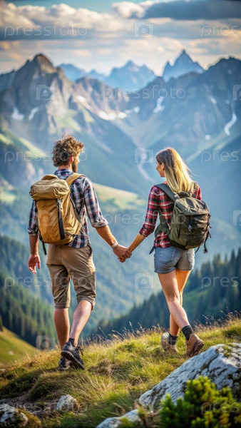 Открытый снимок пары, ходящей в горах. генеративный ИИ