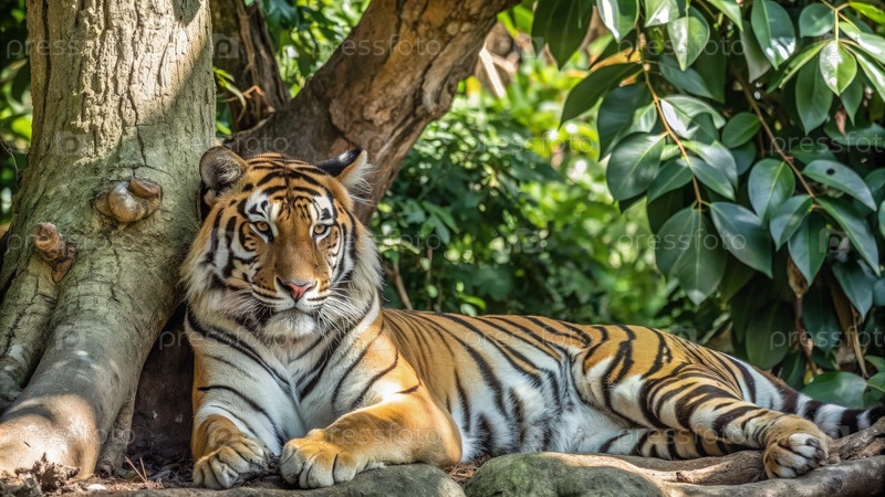 Величественный тигр, отдыхающий в тени пышного дерева