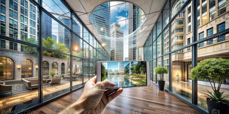 Удерживая смартфон, захватывая городской пейзаж через современные окна офисных зданий