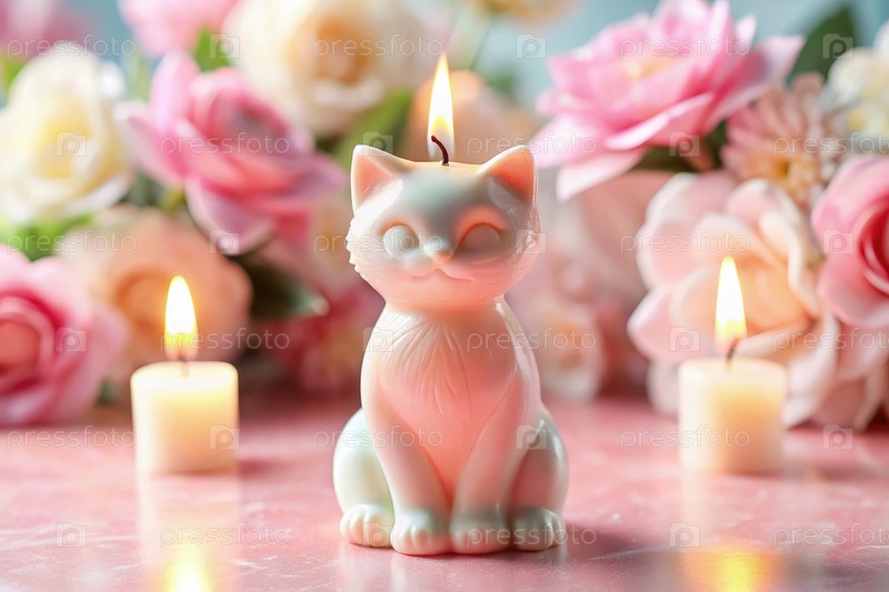 Свеча в форме кошки горит среди розовых роз