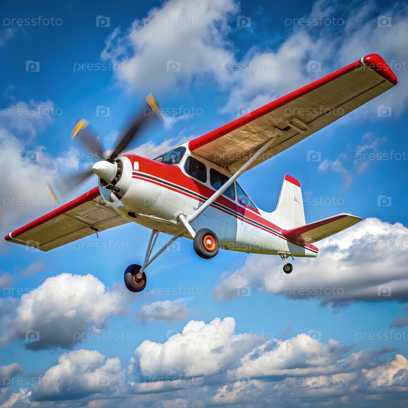 Бело-белый одномоторный пропеллерный самолет, летящий по голубому небу с белыми пушистыми облаками