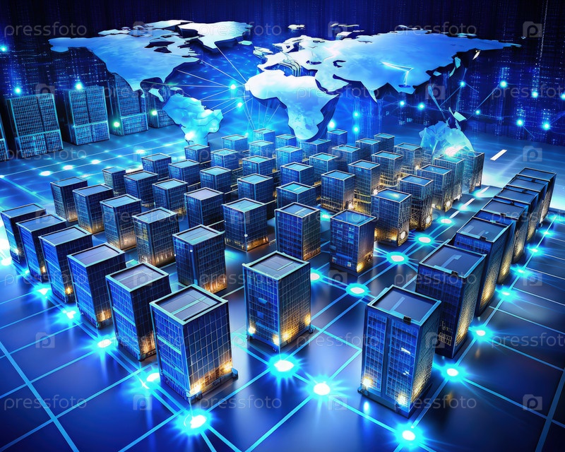 Глобальная сеть распределения данных с освещенными серверами. генеративный ИИ