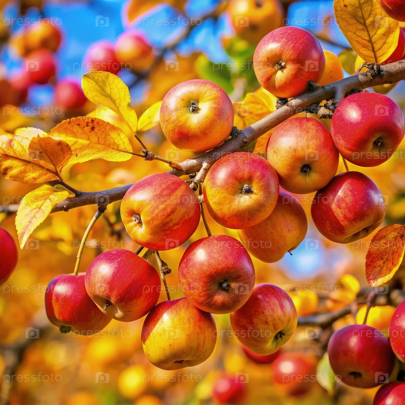 Зрелые красные яблоки, висящие с ветвей осеннего яблони