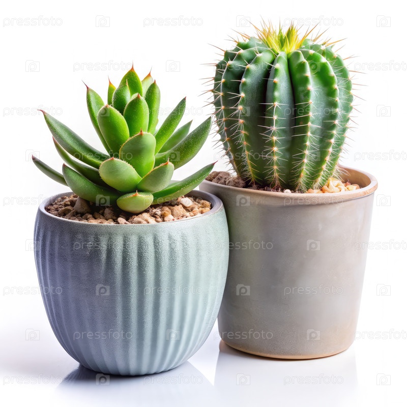 Зеленые кактусы и сочные растения в керамических горшках на белом фоне