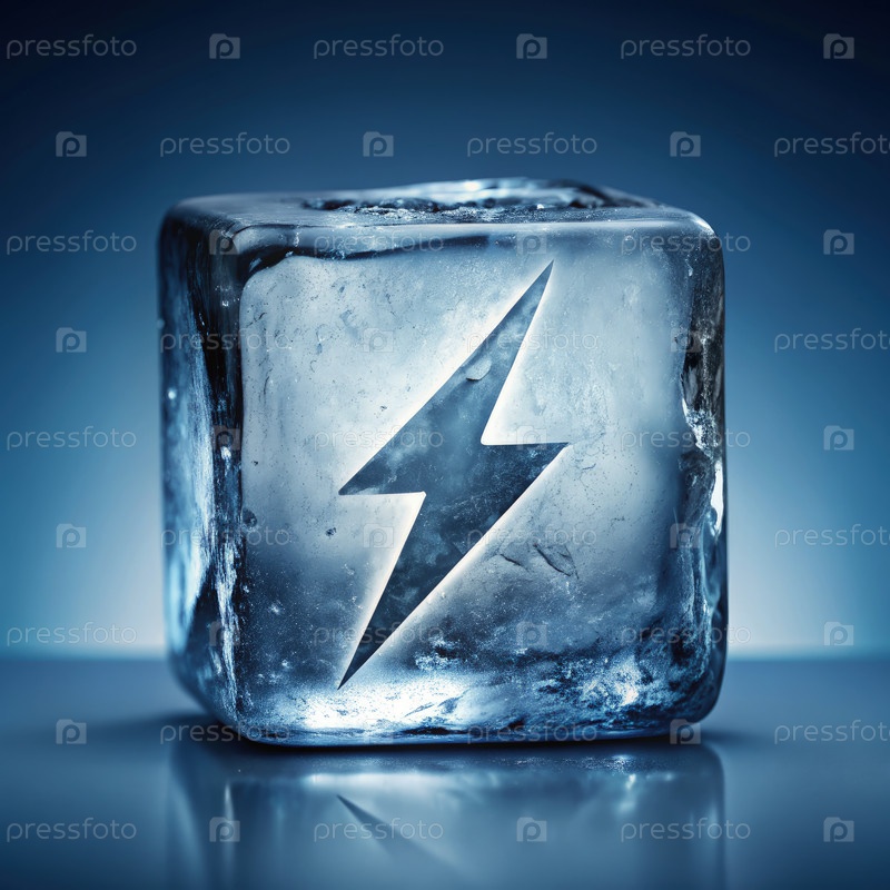 Икона молнии в кубике льда на синем фоне