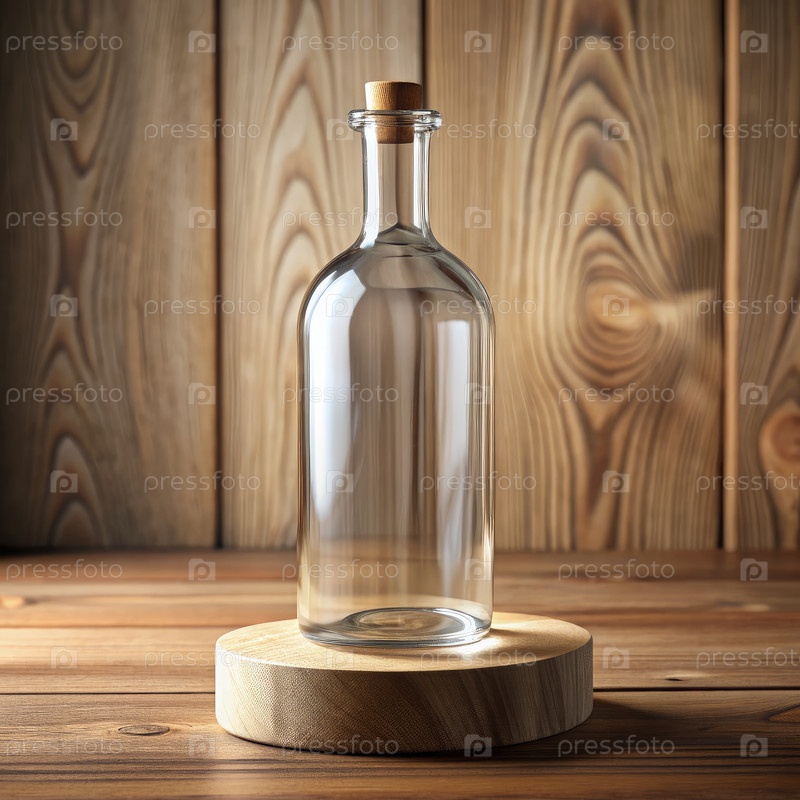 Пустая стеклянная бутылка с пробкой на деревянной платформе. генеративный AI