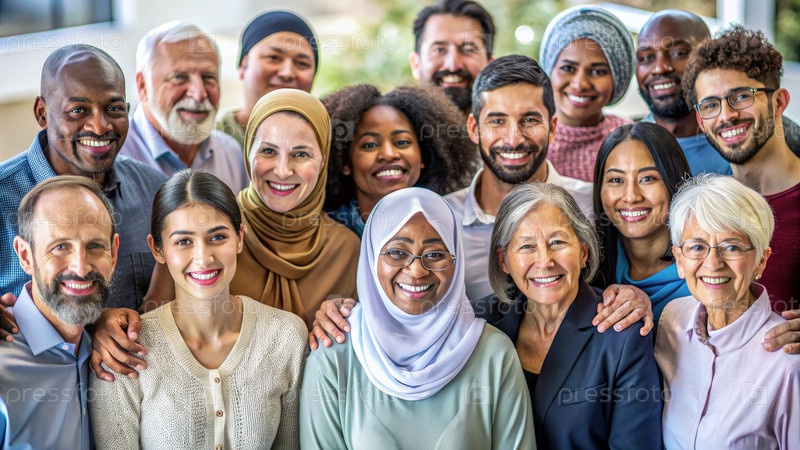 Разнообразная группа улыбающихся людей, стоящих вместе в современной обстановке