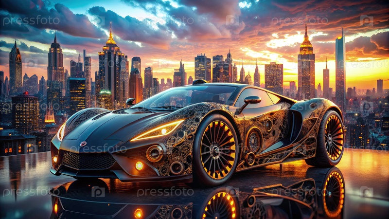 Черный суперкар с украшенным дизайном припаркован перед горизонтом города на закате