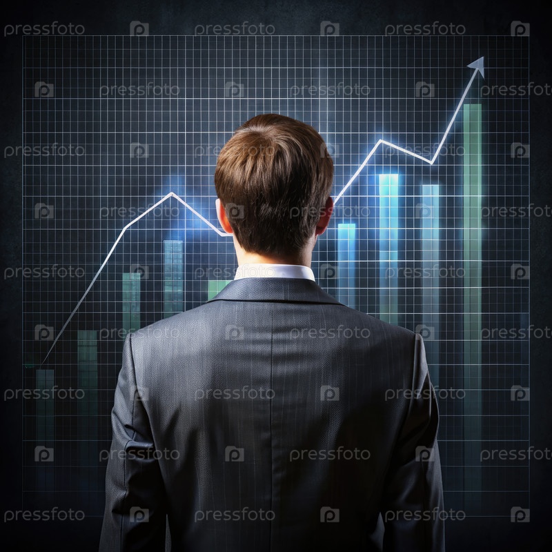 Бизнесмен просматривает график восходящего тренда в темной комнате