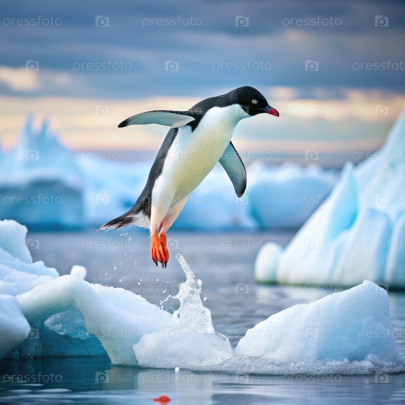 Пингвин Адель прыгает между ледяными плитами в Антарктиде