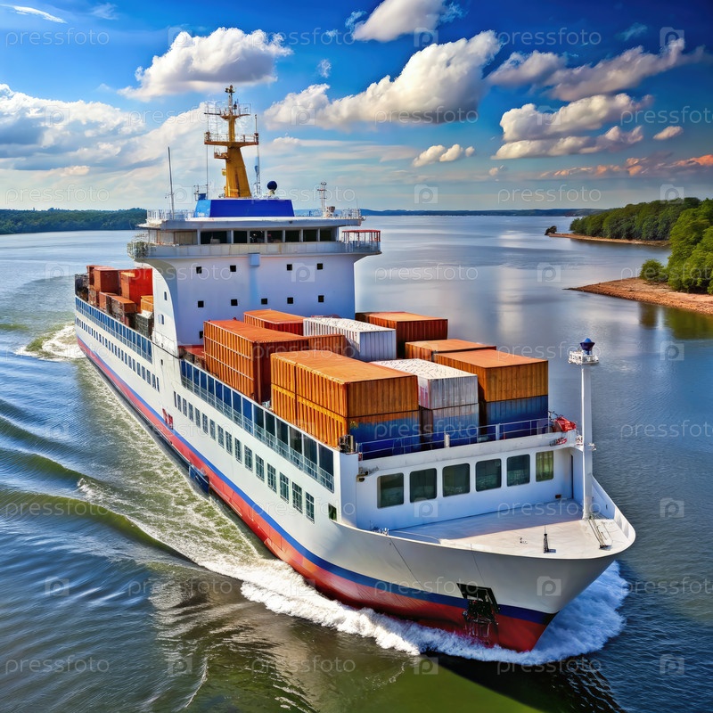 Грузовой паром, плавающий через узкий канал в солнечный день