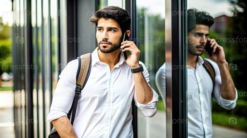 Испанский студент-мужчина разговаривает по телефону снаружи здания