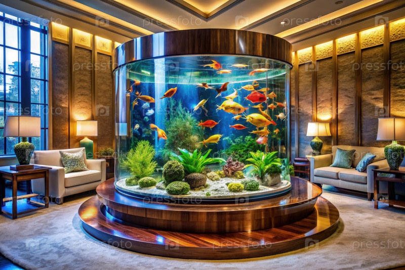 Большой круглый аквариум для рыб в роскошном дизайне интерьера. генеративный AI