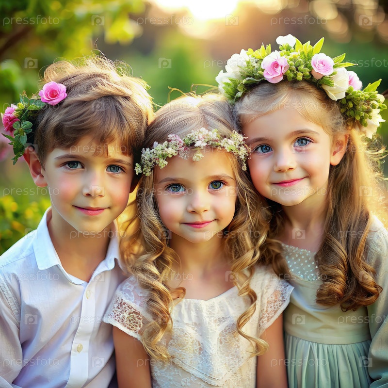 Три очаровательных ребенка, носящих цветочные короны в солнечном саду