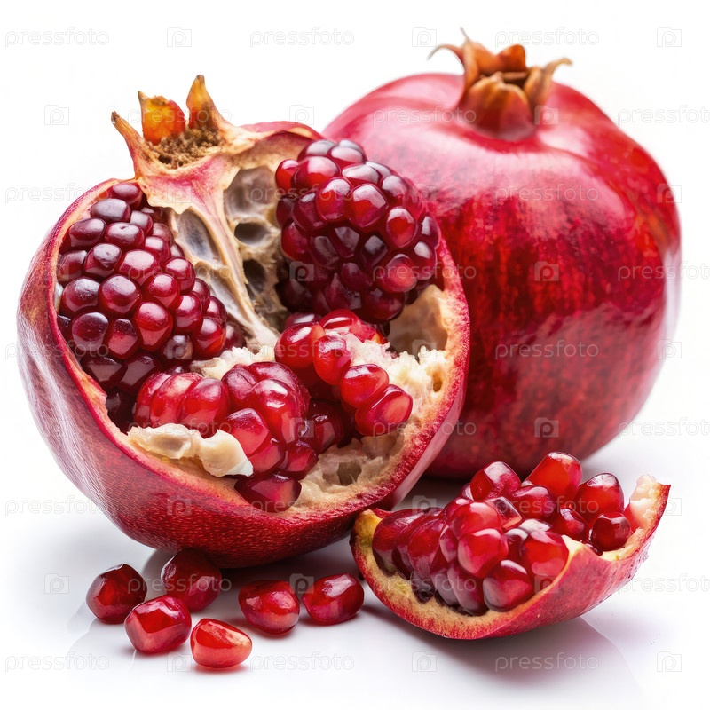 Зрелый гранат, разрезанный открытым и рассеянным на белой поверхности
