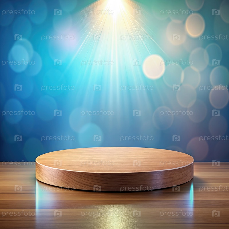 Деревянный подиум на синем фоне со светофором