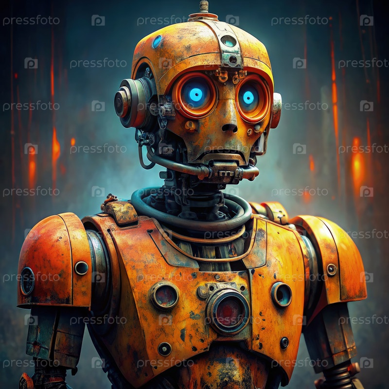 Рыжий робот с сияющими голубыми глазами смотрит вперед в промышленной среде. генеративный ИИ