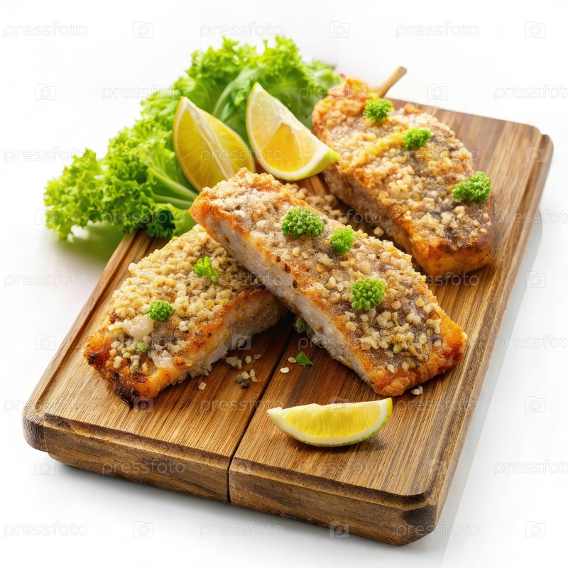 Crispy Breadcrumb-Crusted Salmon Fillet подается на деревянной доске для резки. генеративный AI