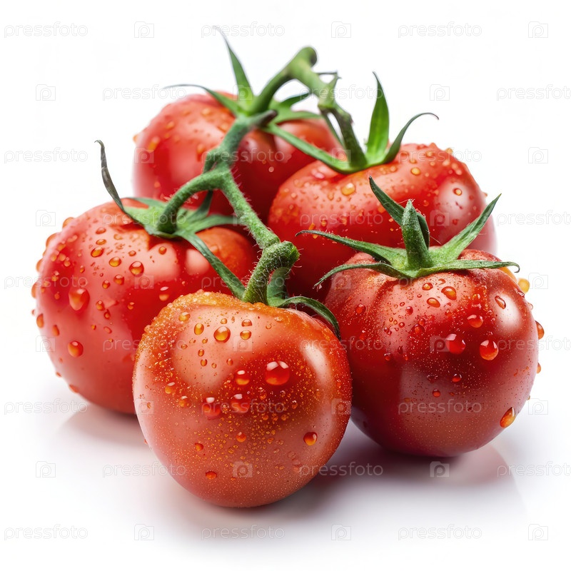 Свежие красные сливочные помидоры с капельками воды на белом фоне