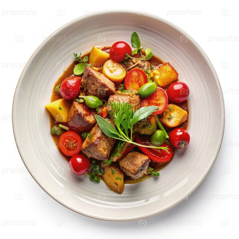 Вид на тарелку говядины с картофелем, помидором и травами