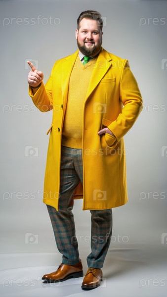 Человек в желтом пальто указывает направо на студийный портрет