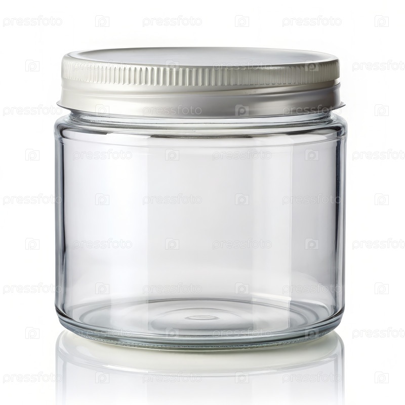 Прозрачная стеклянная банка с серебряным крышкой на белом фоне
