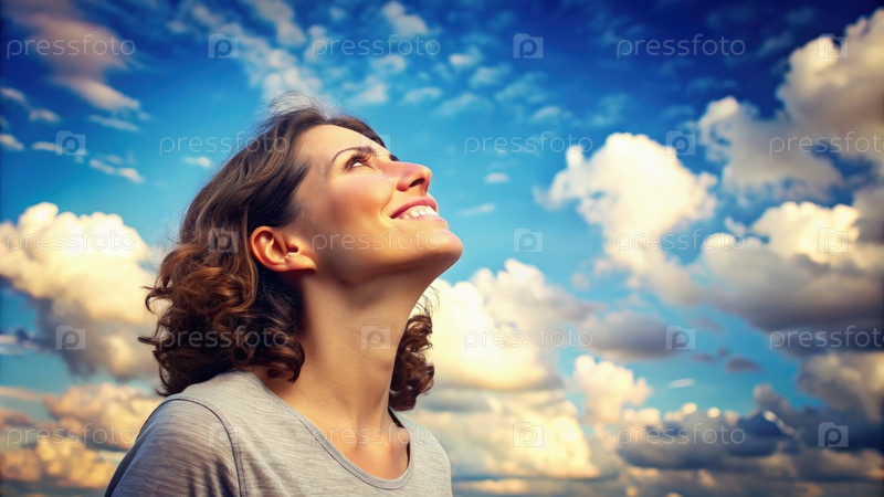 Женщина, смотрящая в голубое небо с улыбкой в солнечный день