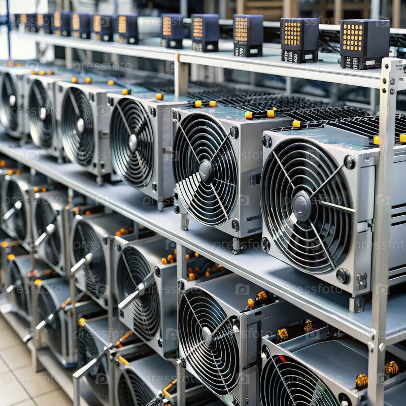 Ряд оборудования для майнинга биткойнов в промышленной среде. генеративный ИИ