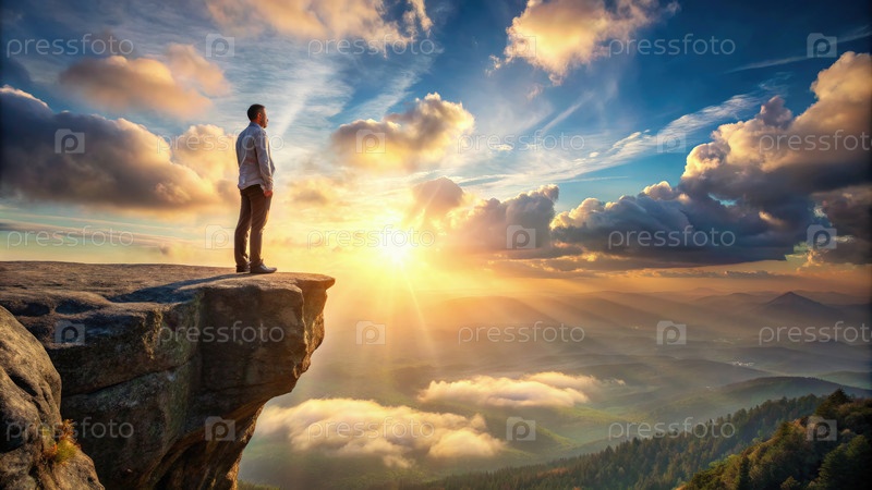 Решительный человек стоит на горной скале при закате солнца