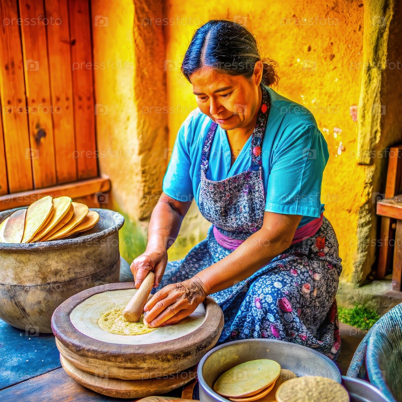 Женщина, измельчающая кукурузу для тортилей на метате в традиционной мексиканской кухне