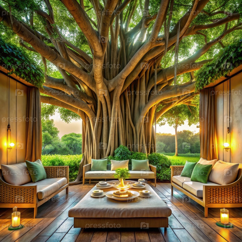 Расслабляющий вечер под баняном в тропическом саду