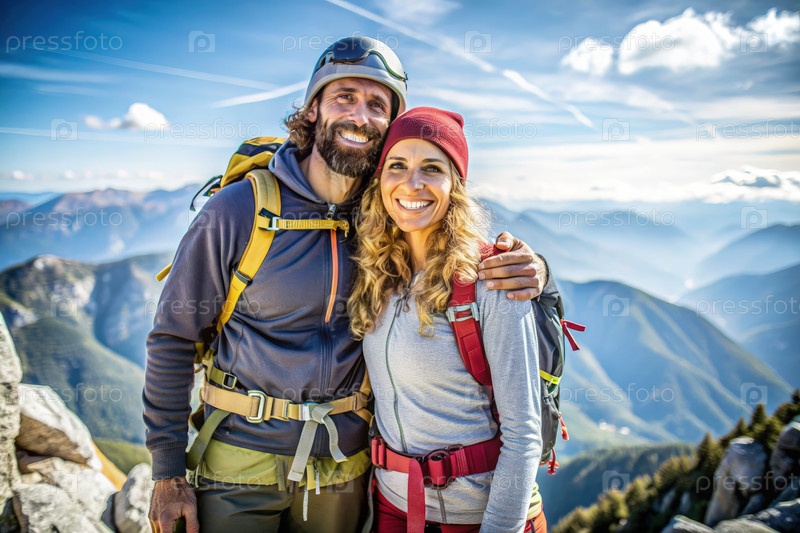 Счастливая пара позирует на горном пике после похода