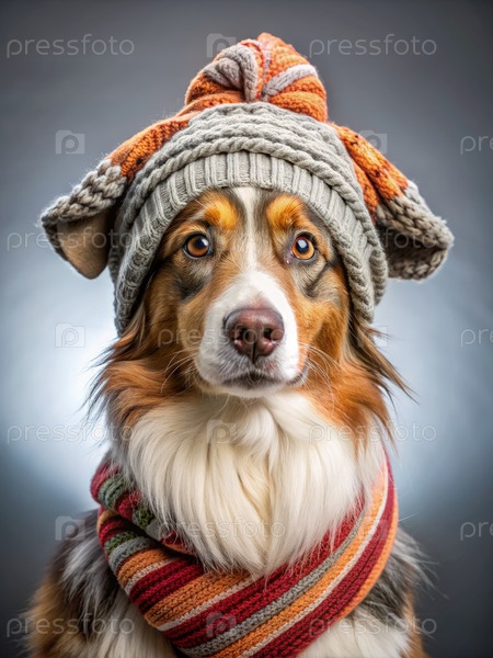 Австралийская овчарка, носящая трикотажную шляпу и шарф