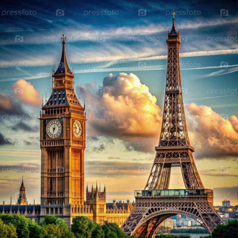 Эйфелева башня и Биг-Бен в облачном небе на закате