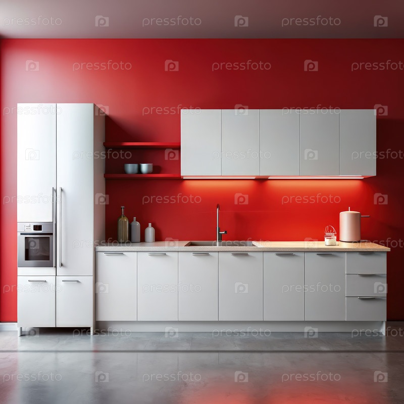Белая кухня с красной стеной и под освещением шкафа