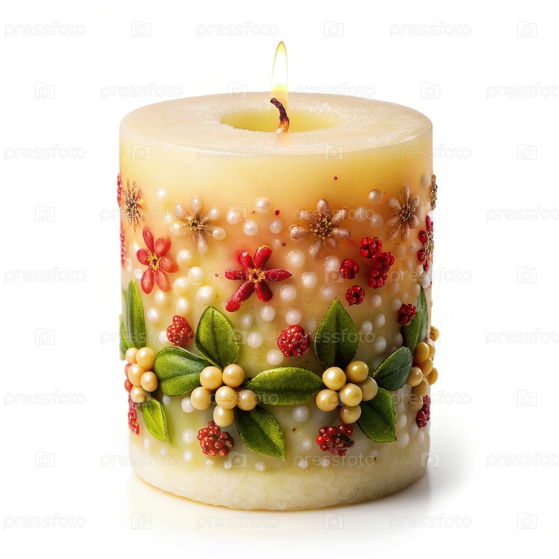 Декоративная цветовая свеча с зелеными листьями и ягодами