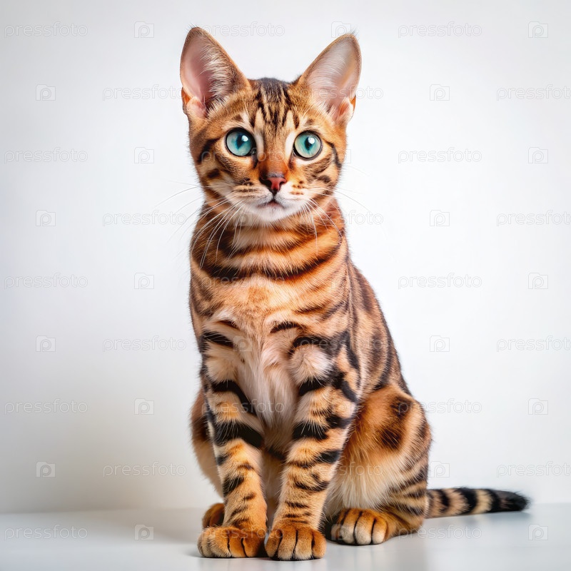 Бенгальская кошка с поразительными голубыми глазами, сидящая на белой поверхности