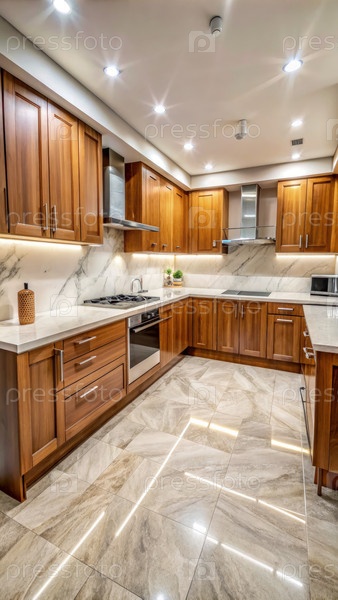 Кухня с деревянными шкафами и мраморными столешницами