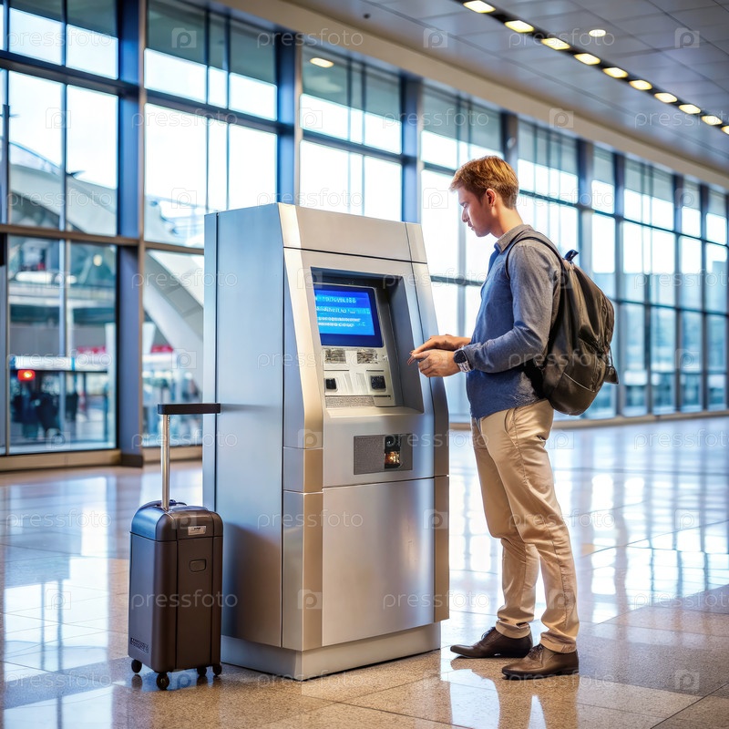 Человек использует торговый автомат аэропорта для печати тегов багажа