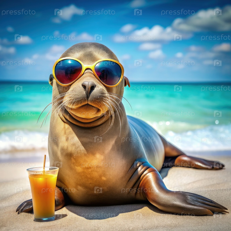 Морской лев отдыхает на пляже с солнцезащитными очками и напитком