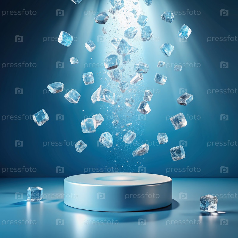 Подиум одного продукта с падающими кубиками льда на синем фоне