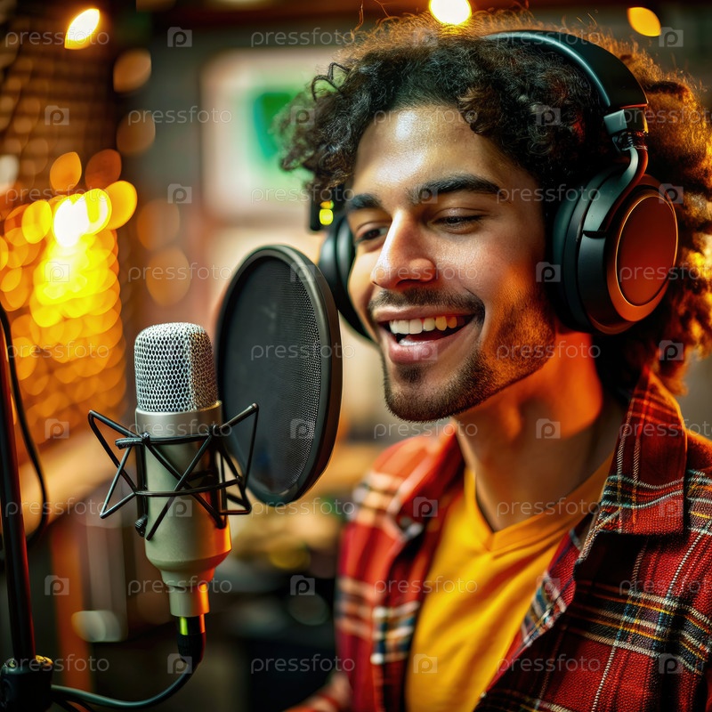 Мужчина-голосовой артист поет в микрофон в студии звукозаписи