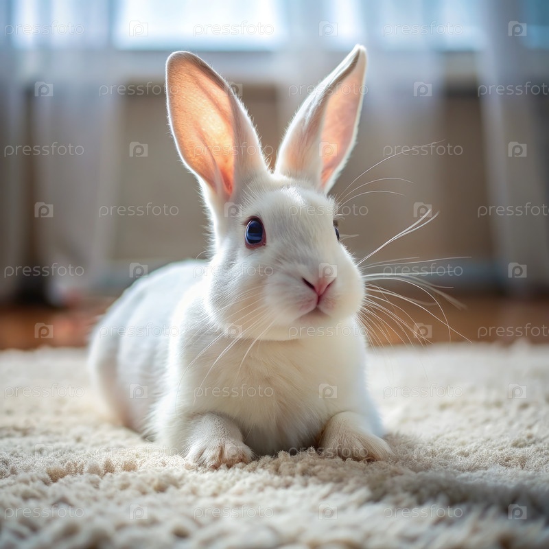 Белый домашний кролик лежит на ковре в доме