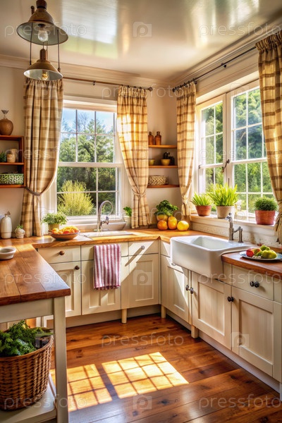 Солнечная деревенская кухня с квадратными шторами и деревянным полом
