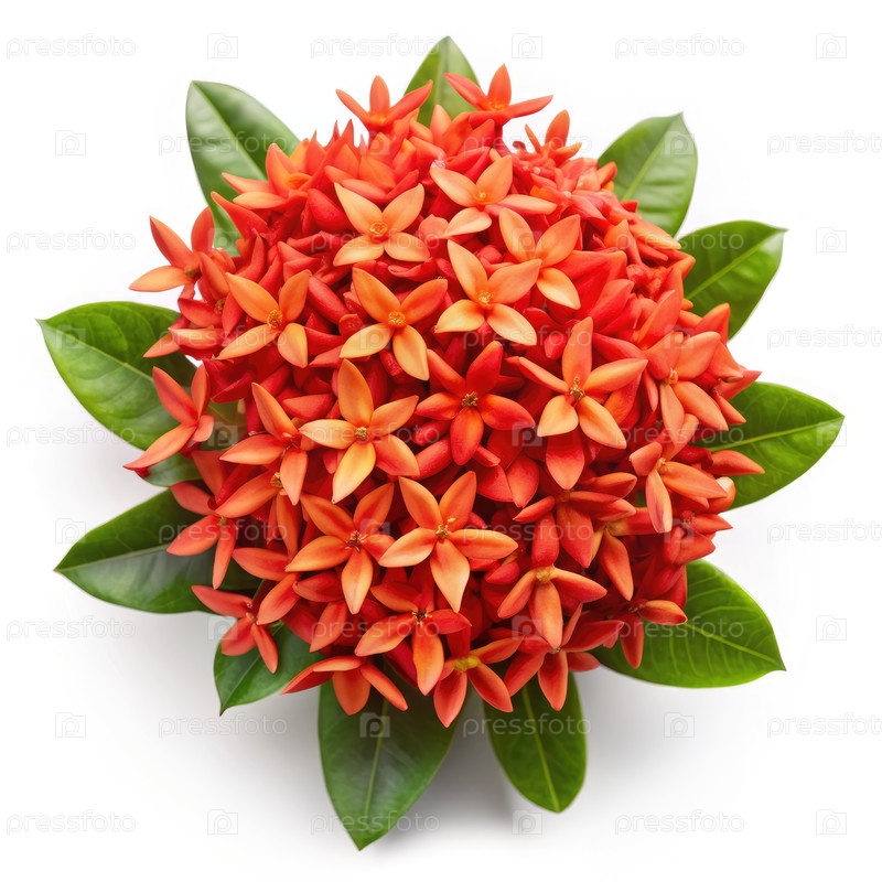 Верхний вид клумбы цветов Ixora с зелеными листьями на белом фоне