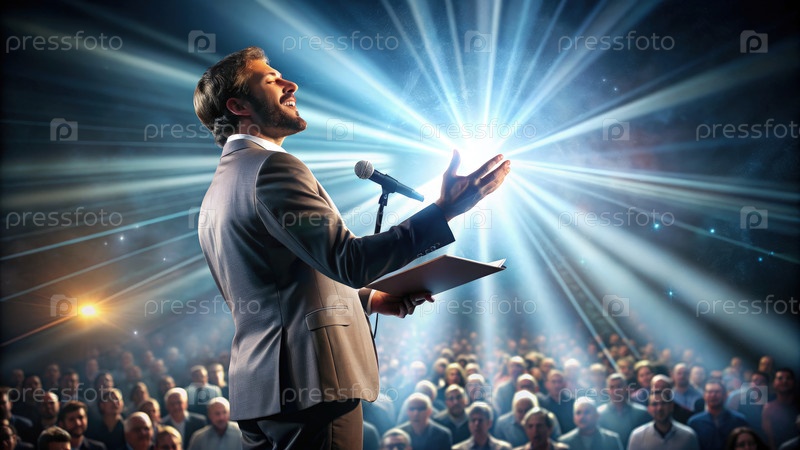 Уверенный спикер обращается к большой аудитории с яркими световыми фонарями. генеративная ИИ