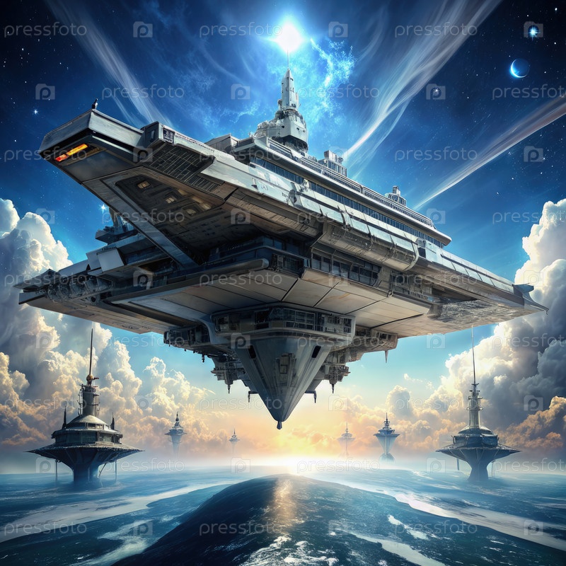Гигантский инопланетный боевой корабль, паривший над футуристическим морем