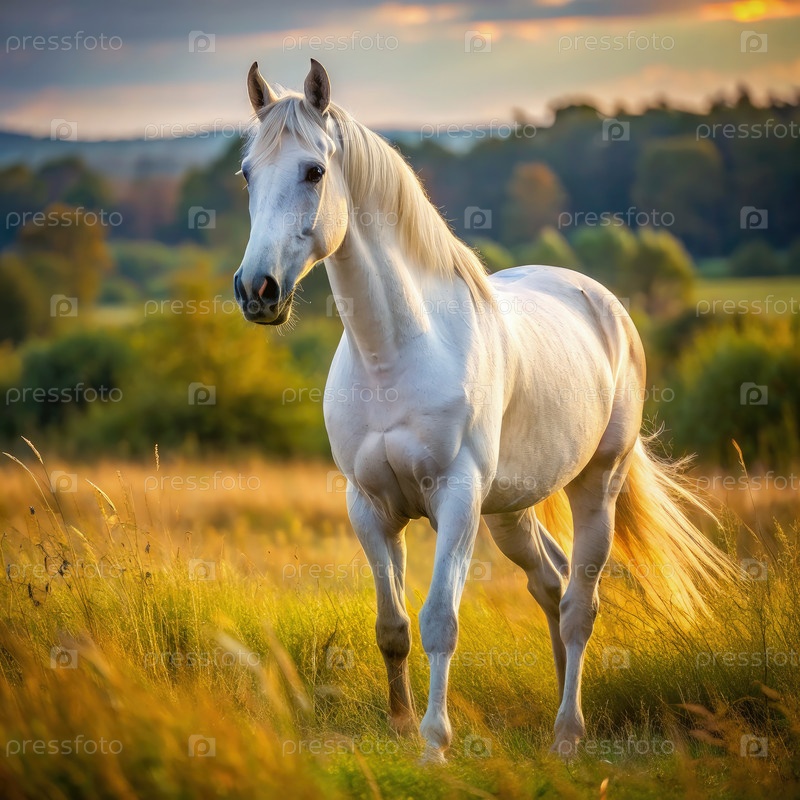 Белый конь стоит на поле при закате солнца
