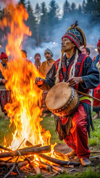 Шаман играет на барабане во время традиционной церемонии пожара в лесной обстановке